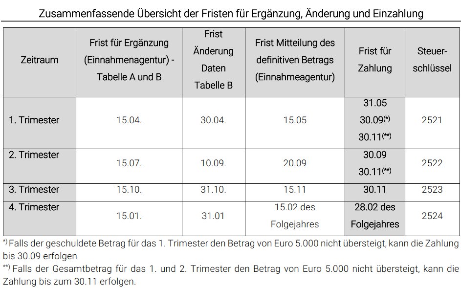 Die Zahlungsfristen sind demnach: 31. Mai (1. Trimester), 30. September (2. Trimester) 30. November (3. Trimester) und 28. Februar des Folgejahres (4. Trimester).
