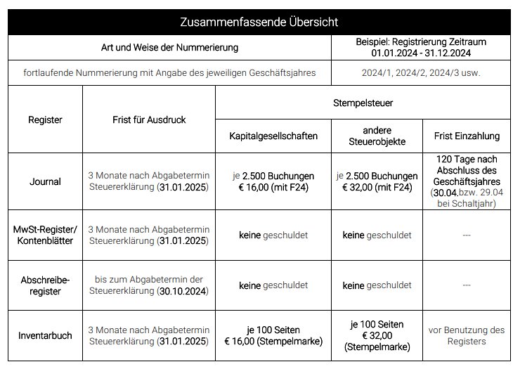 Mit dem vorliegenden Rundschreiben weisen wir darauf hin, dass der vorgeschriebene Ausdruck der Geschäfts- und Gesellschaftsbücher sowie des Inventarbuches für die Steuerperiode 2023 innerhalb von 3 Monaten ab Abgabetermin der Steuererklärung (30.10.2024), also bis 31.01.2025, vorzunehmen ist. Eine Ausnahmeregelung gilt für das Abschreiberegister, welches innerhalb des Termins zur Abgabe der Steuererklärung des betreffenden Jahres zu drucken ist. Das Abschreiberegister 2023 musste also bis spätestens 30.10.2024 ausgedruckt werden (erfolgt durch unser Büro, sofern wir für Sie das Abschreiberegister führen).