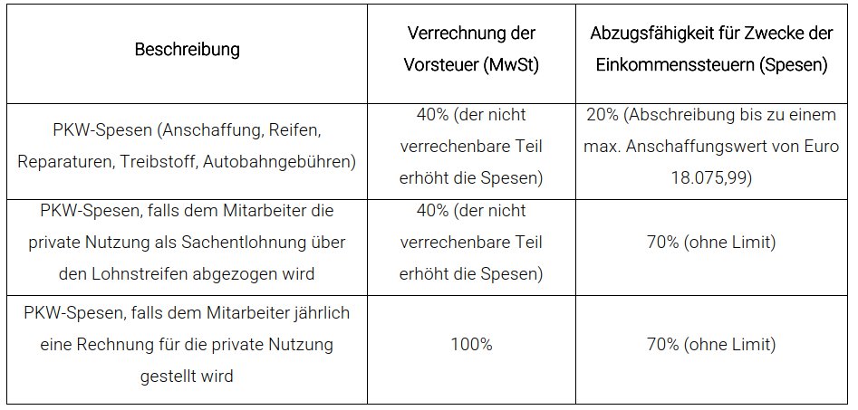 Unternehmen haben die Möglichkeit, ihren Mitarbeitern (Personen mit Verwalterbezügen sind ausgeschlossen) einen Firmenwagen zur Verfügung zu stellen, welcher neben der betrieblichen Nutzung auch privat genutzt werden kann. Das errechnete Kilometergeld für die private Nutzung wird entweder als Sachentlohnung im Lohnstreifen ausgewiesen (und unterliegt somit den Sozialabgaben und Lohnsteuern) oder dem Mitarbeiter mit Mehrwertsteuer in Rechnung gestellt. Diese Vorgehensweise gewährt dem Arbeitgeber Vorteile in Bezug auf die Absetzbarkeit der Kosten und den Abzug der Mehrwertsteuer für Firmen-PKWs. Beispielsweise können für einen Firmen-PKW mit ausschließlich betrieblicher Nutzung nur 20% der Anschaffungskosten bis zu einem Höchstbetrag von Euro 18.075,99 sowie 20% der laufenden Führungskosten steuerlich abgesetzt werden. Wird derselbe Firmen-PKW jedoch einem Mitarbeiter als Sachentlohnung auch für die private Nutzung zur Verfügung gestellt, können 70% der Anschaffungskosten (ohne Höchstbetrag) sowie 70% der laufenden Führungskosten steuerlich abgesetzt werden. Erfolgt die Anlastung an den Mitarbeiter anhand einer Rechnung, kann zudem die Mehrwertsteuer für den Ankauf und für die laufenden Betriebskosten des Fahrzeuges zur Gänze verrechnet werden. In allen anderen Fällen können lediglich 40% der Mehrwertsteuer in Abzug gebracht werden.