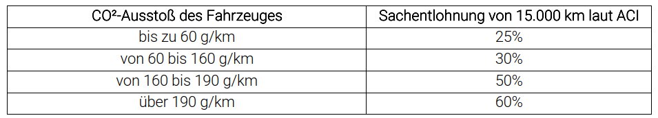 Die Grundlage für die Berechnung des Kilometergeldes bzw. der Sachentlohnung bilden die aktuellen ACI-Tarife für 15.000 km. Diese können unter www.aci.it heruntergeladen werden. Zudem muss bei der Berechnung beachtet werden, ob das Fahrzeug vor oder nach dem 1. Juli 2020 zugelassen und dem Arbeitnehmer zugewiesen wurde:
