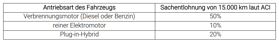 - bei Zulassung und Zuweisung des Fahrzeuges innerhalb 30. Juni 2020 beträgt die Sachentlohnung 30% der pauschalen Kilometerleistung von 15.000 Kilometern pro Jahr;