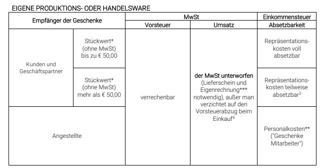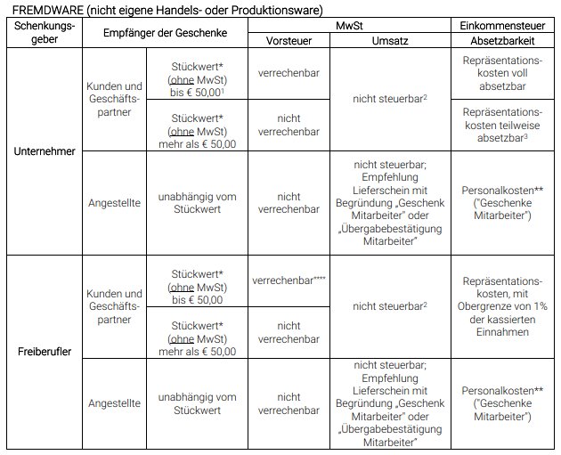 **** gemäß einer wörtlichen und sehr vorsichtigen Auslegung des Art. 2, Abs. 2 Ziffer 4, VPR 633/1972 gilt der MwSt-Abzug für Geschenke an Kunden/Geschäftspartner mit Wert bis zu € 50,00 nur für Unternehmer und nicht für Freiberufler – das Gesetz spricht hier ausschließlich von „… attività propria dell’impresa…“. Demnach dürften Freiberufler die MwSt auch für den Ankauf von Geschenken im Wert von bis zu € 50,00 nicht in Abzug bringen bzw. müssten eine Eigenrechnung ausstellen, sofern sie die MwSt beim Ankauf in Abzug bringen. In der Fachdoktrin wird jedoch mehrheitlich die Auffassung vertreten, dass die Bestimmung der Unternehmen auch für die Freiberufler anwendbar ist.